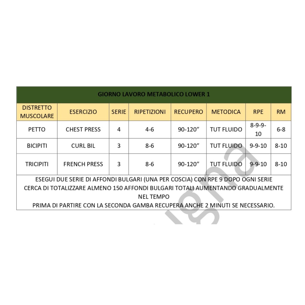 Mi sono limitato a postare solo uno dei due giorni di metabolico essendo molto simile ed ho tralasciato l’upper body per non dilungarmi più del dovuto con informazioni non attinenti all’argomento.